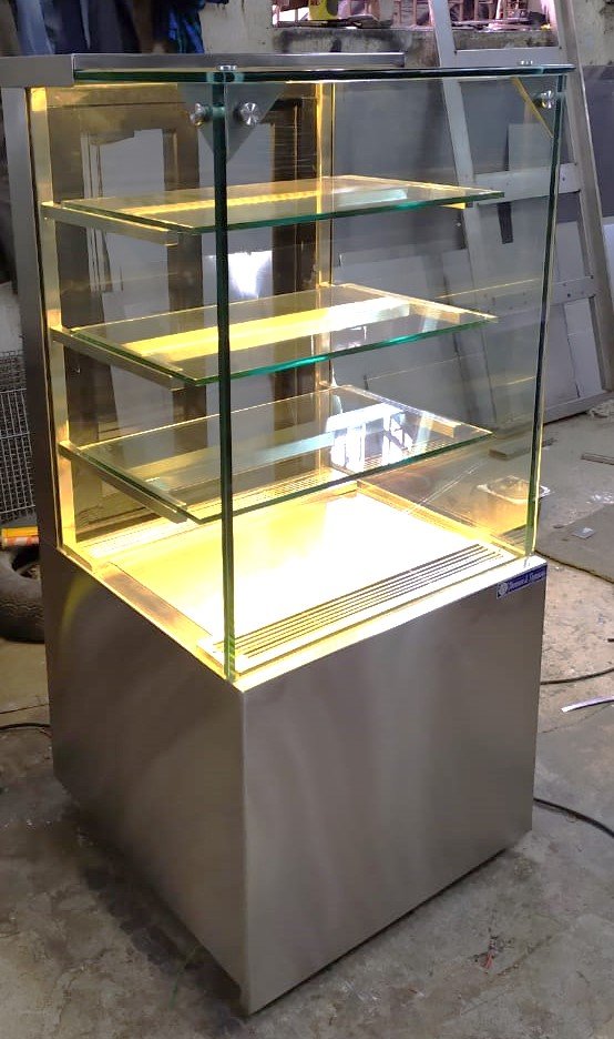 A Cold Display Counter with Stainless Steel (SS) Base, measuring 24″ (W) × 24″ (D) × 50″ (H), featuring a 3-shelf design, is an excellent choice for displaying chilled items in commercial settings such as bakeries, sweet shops, and retail outlets.