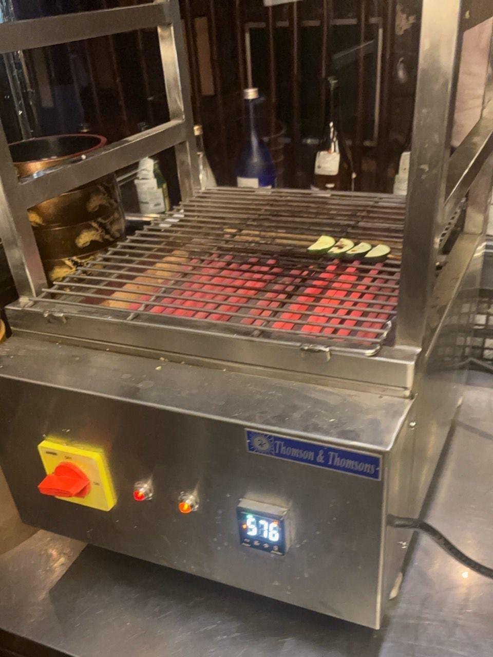 A Tabletop electric lava rock grill is a compact grilling appliance designed for countertop use in commercial kitchens. It combines electric heating with lava rocks, which are natural volcanic stones that retain and radiate heat efficiently, mimicking traditional charcoal grilling.