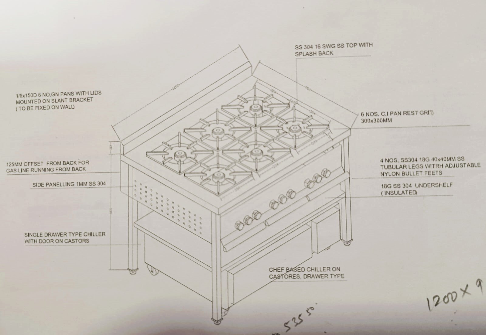 SS 304 18G Top Front & Both Side Turned Down 50 Mm And In 15 Mm. 6 Nos 250x250mm Heavy Duty Cast Iron Removable Vessel Rest. 6 Nos C35 United Make Burners With Control Knobs. Swg 20g SS Grade Sheet Three Side Covering With Air Vents On Both Sides. Legs 4 Nos SS 304 18g 40×40 Mm Tubular Legs With Adjustable Nylon Bullet Feet. All Inside Gas Line Pipe Are Made Up Of SS.